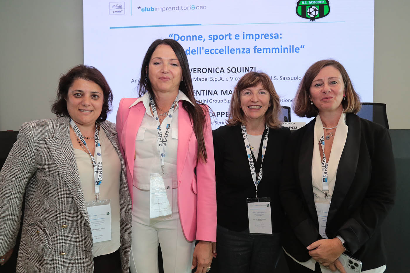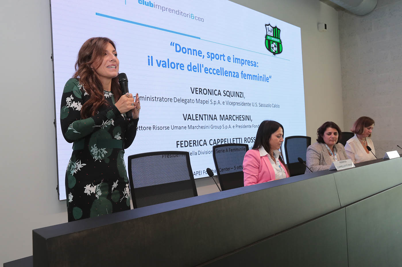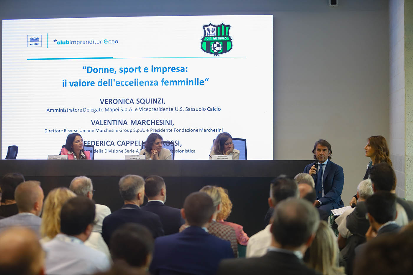 Protagoniste dell’evento al femminile, Veronica Squinzi, Amministratore Delegato di Mapei e Vicepresidente U.S. Sassuolo Calcio, Valentina Marchesini, Direttore Risorse Umane di Marchesini Group e Presidente Fondazione Marchesini e Federica Cappelletti Rossi, Presidente della Divisione Serie A Femminile Professionistica, che hanno raccontato la propria esperienza professionale di donne in ambienti altamente competitivi.